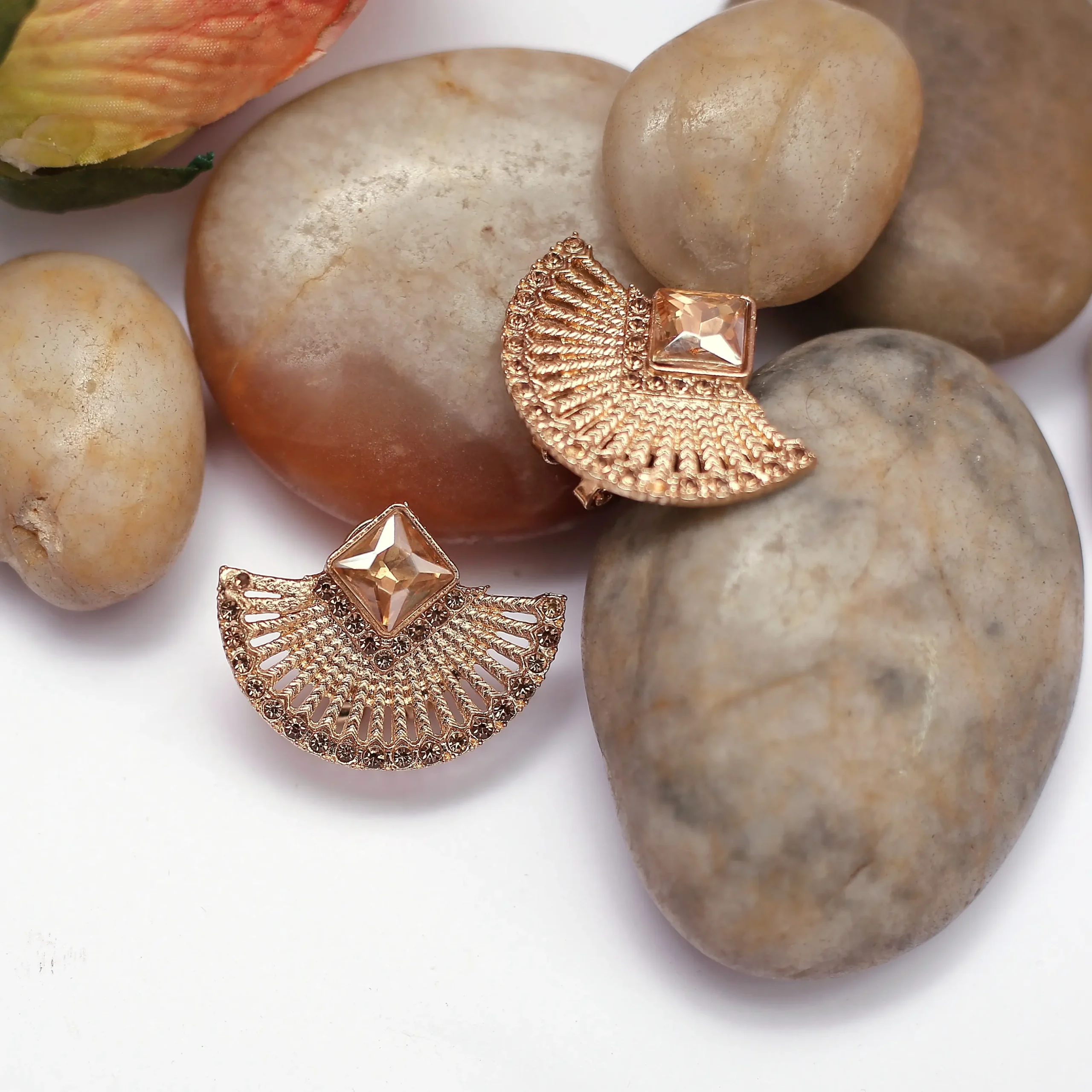 Architectural, warm and quietly commanding. The Pericon Earrings are a fan-shaped stud in rose gold, with a beautifully textured semi-circular body featuring fine radiating lines and an open lattice design along the curved hem. A bold square-cut champagne crystal sits at the top, anchoring the piece with a flash of warmth. Inspired by the spirited flair of flamenco, these earrings add structure and personality to any look, no occasion required.